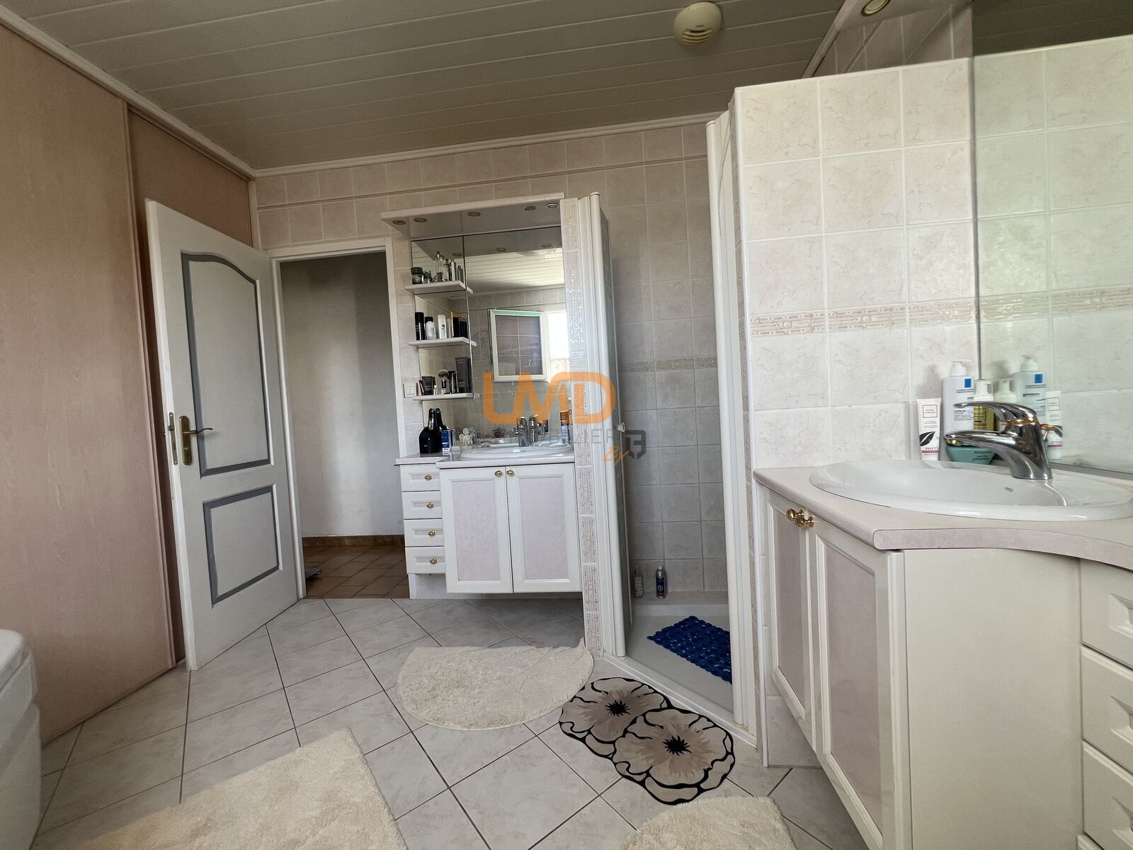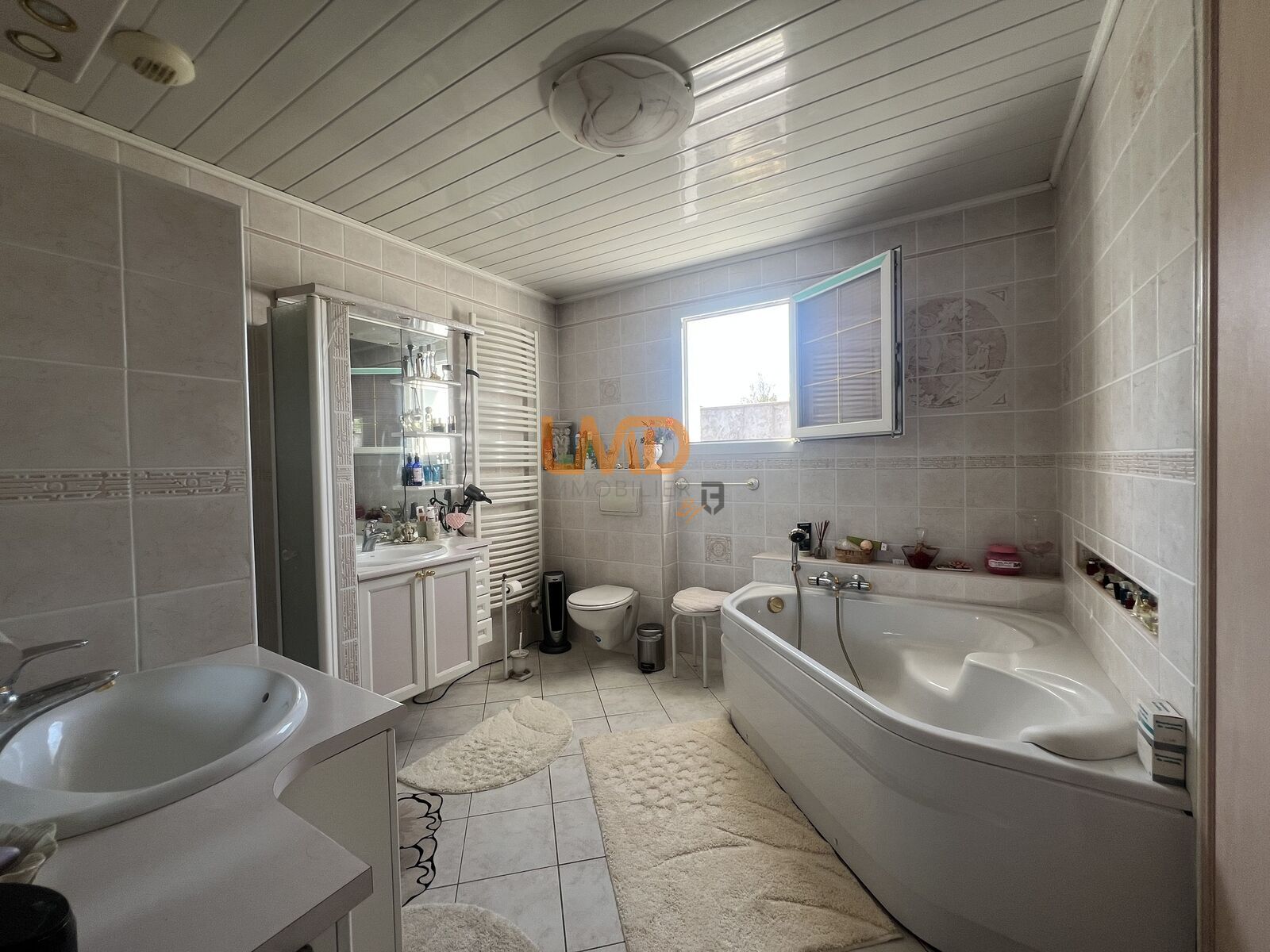 Une grande salle de bains et une salle d’eau avec un WC