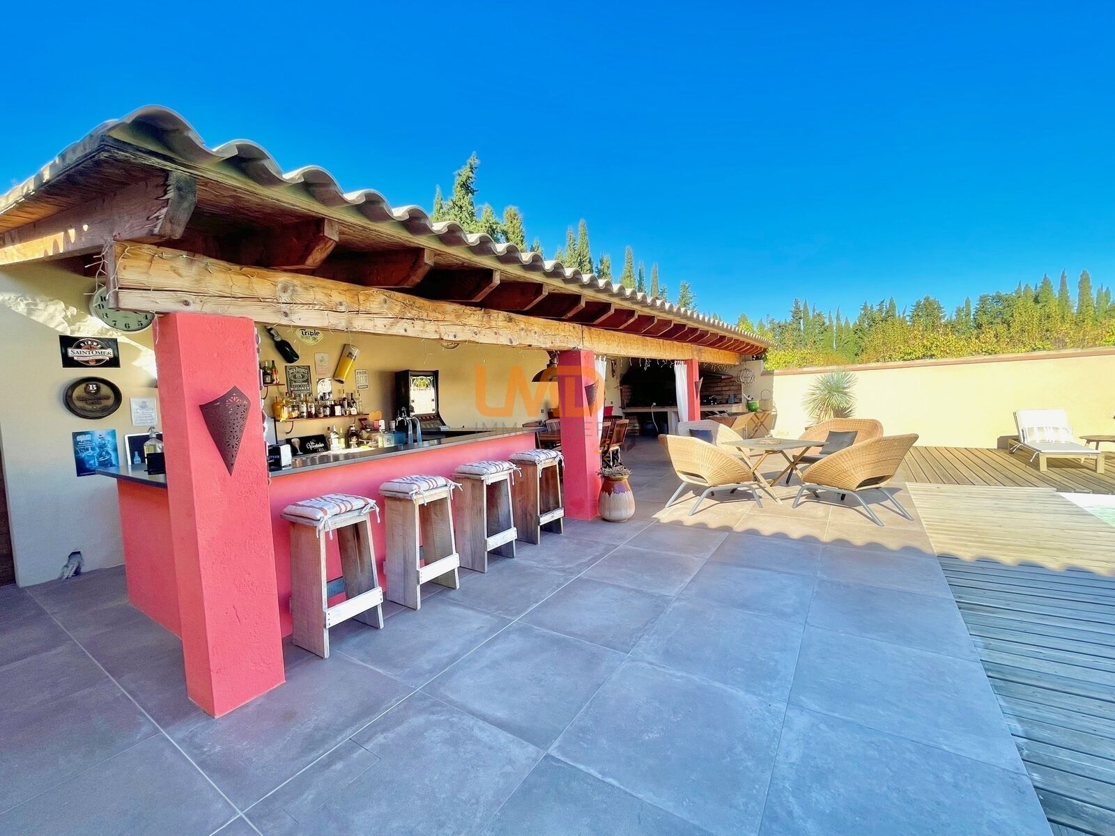 Cuisine d'été avec espace bar et barbecue totalisant un espace couvert d'environ 40 m2, avec accès direct sur le salon d'été et une piscine 6 x 8.