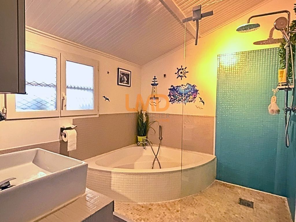 La salle de bains principale, spacieuse, est équipée d’une baignoire d’angle, d’une douche à l’italienne et d’un wc. La seconde salle d’eau propose quant à elle une cabine de douche ainsi qu’un wc, idéal pour le quotidien.