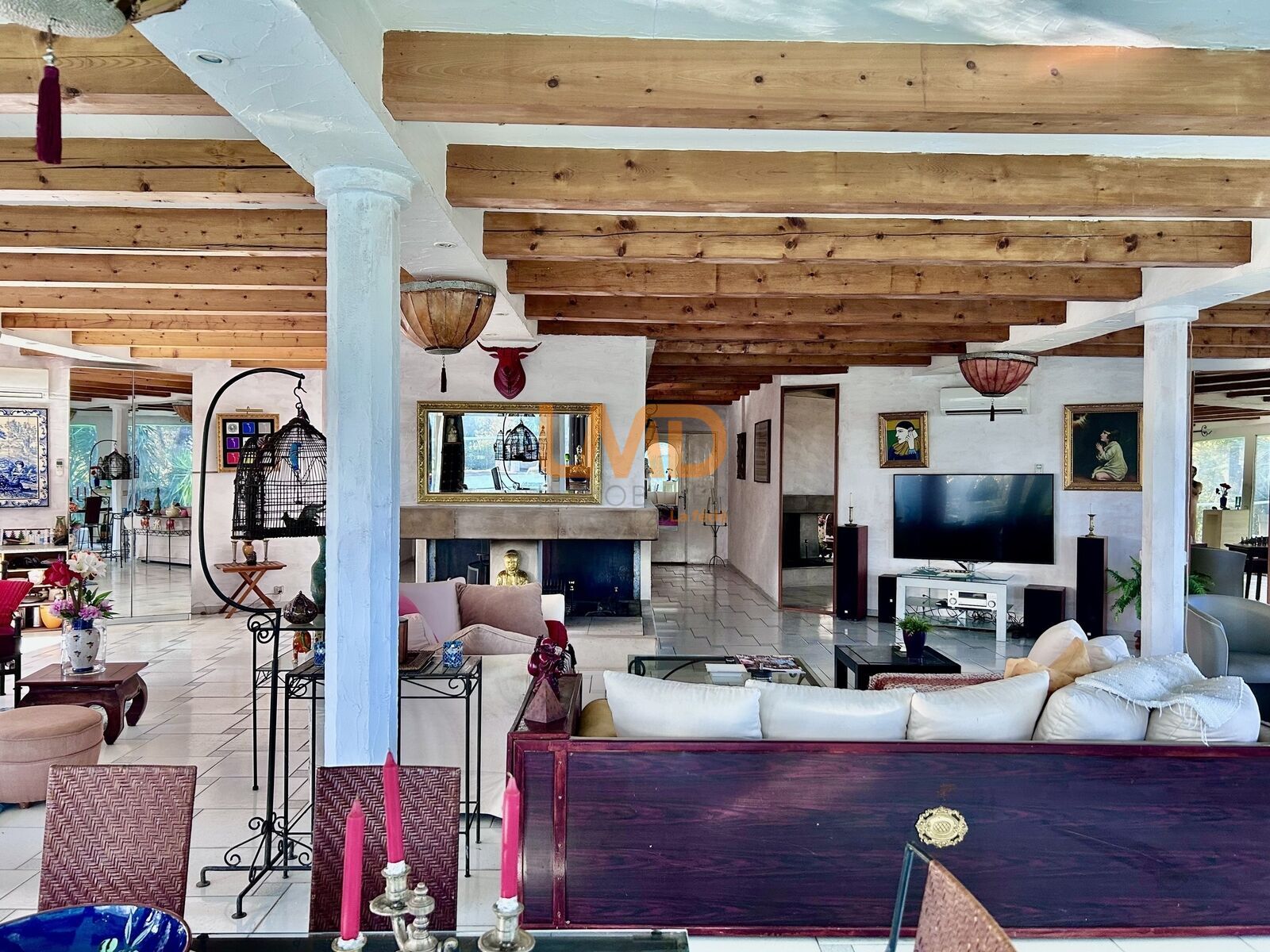 le RDC se compose d'une pièce de vie de 170 M2 environ, avec sa cheminée magistrale et centrale, avec des baies vitrées et un accès direct aux différentes terrasses et à la piscine.