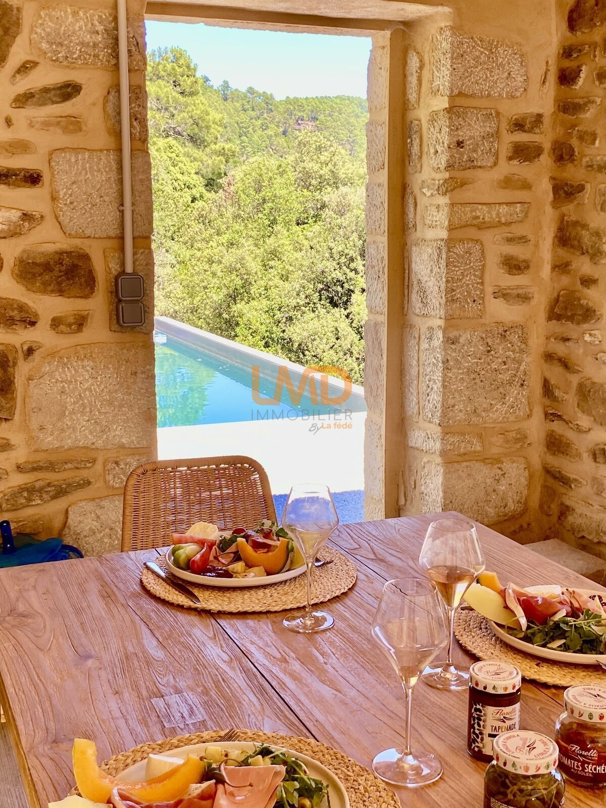 Face à la pièce de vie se trouve une terrasse de 70 M2 environ et dans le jardin la piscine de 11M x 4M avec son pool house de 30 M2 environ et une terrasse de 25 M2
