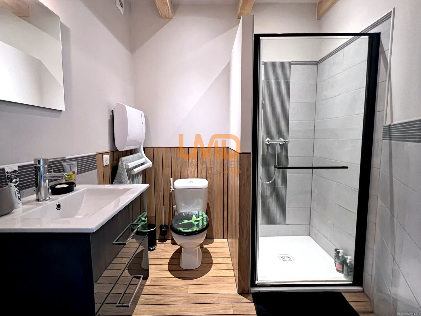 Deuxième étage: Salon, salle d'eau avec wc, chambre parentale avec wc et douche.